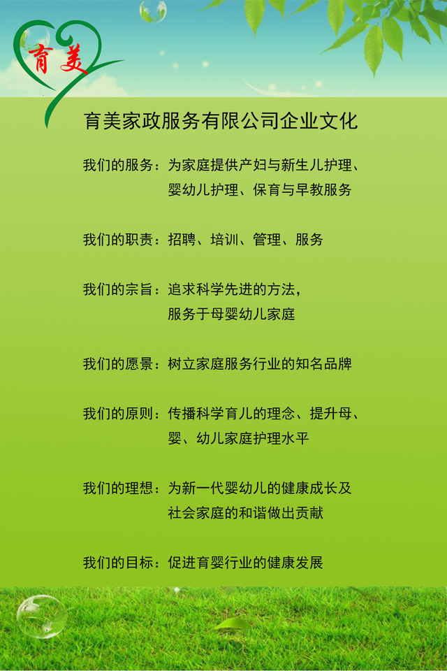 育美家政 專于婦嬰 來自華東 服務鄭州/育美家政服務有限公司是一家員工制管理(非中介)的公司。 主營業(yè)務:產(chǎn)婦護理和新生兒護理/0-3歲嬰幼兒護理/催乳按摩服務/月嫂和育嬰師培訓/家庭育兒入戶指導